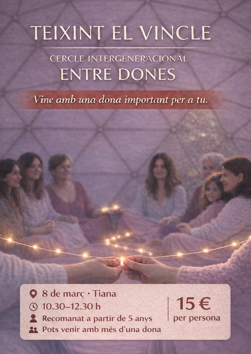 Teixint el Vincle és una trobada íntima dins el dom geodèsic a Tiana, a la Serralada de Marina, pensada per a mares i filles que vulguin compartir un espai de presència, connexió i consciència compartida.Un temps pausat per escoltar-nos, reconèixer-nos i reforçar el vincle des d’un lloc viu i respectuós. Sense presses. Sense exigències. Amb presència.